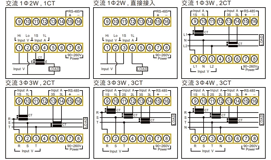 - AC current can directly handle up to 10A (specified); for loads exceeding 10A, additional CT (current transformer, 5A ratio) with adjustable multiplication factors from 1 to 9999 can be configured.